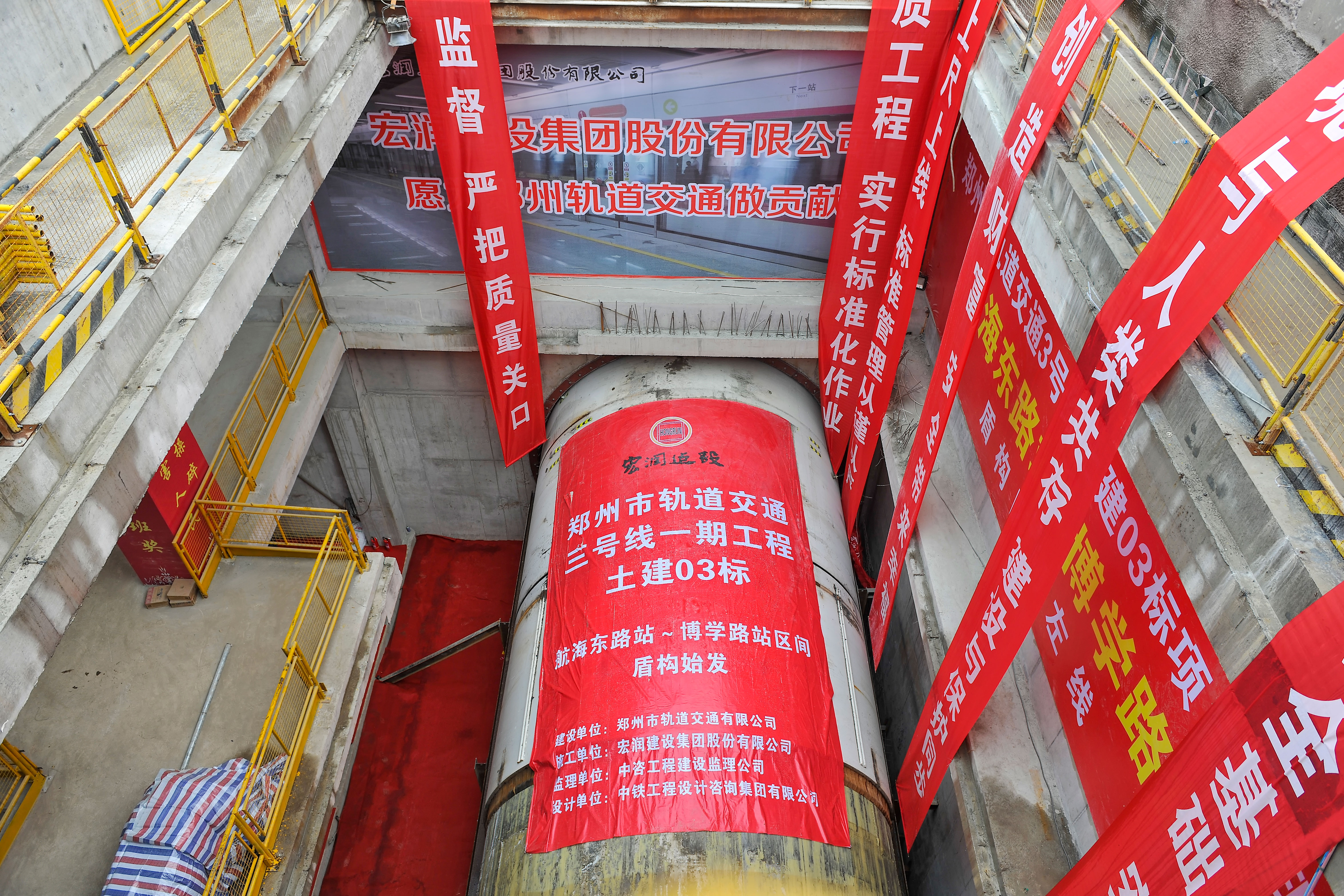10月12日上午,郑州市轨道交通3号线一期工程首台盾构机在礼炮轰鸣声中开始掘进,盾构首发仪式在郑州市轨道交通3号线一期工程航海东路站举行。此次盾构机始发后,由航海东路站向博学路站方向掘进,其中航海东路站设置为盾构始发井,博学路站设置盾构接收井,博学路站~航海东路站区间长约2.65公里,区间共设1个中间风井兼联络通道及泵房、3个联络通道。线路从航海东路站始发后,沿规划中的经开十七大街向北推进,依次下穿中间风井、经北四路、中铁快运集装箱中心站、陇海铁路、陇海高架及宇鑫物流有限公司等,然后由400m圆曲线转向东西方向,沿商都路向东行,最终到达博学路站接收。