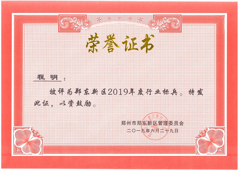 砥砺前行 不忘初心——地铁集团供建中心副主任程明喜获郑东新区2019年度行业标兵
